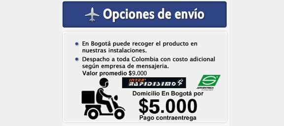 Bogotá recogida en Bodega o servicio contraentrega en su dirección por 6.000 de envío Bogotá, envió nacional $10.000 pesos. Resto del país envió $8.000.